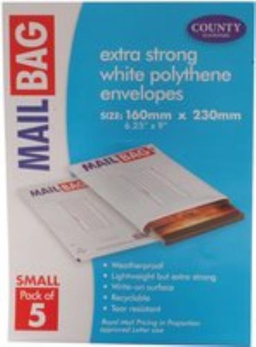 County Polythene Mail bags. Extra strong white polythene envelopes suitable for mailing catalogues and magazines. Size: Small - 160 x 230mm.