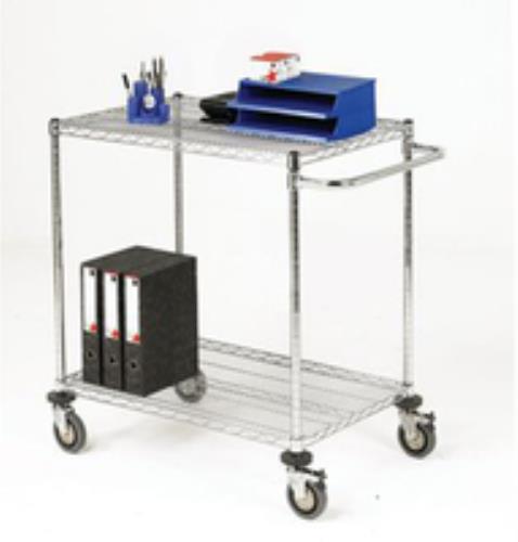 Mobile chrome shelving for storing or displaying items. Shelves adjustable at 25mm intervals. Easily assembled, no tools required. Handle can be positioned at height to suit. Swivel wheeled castors. Overall unit capacity 240kg UDL. W610xD1219xH965mm.