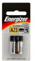Energizer A23/E23A batteries. Commonly used in car alarms, burglar alarm remote controls, and cigarette lighters. -